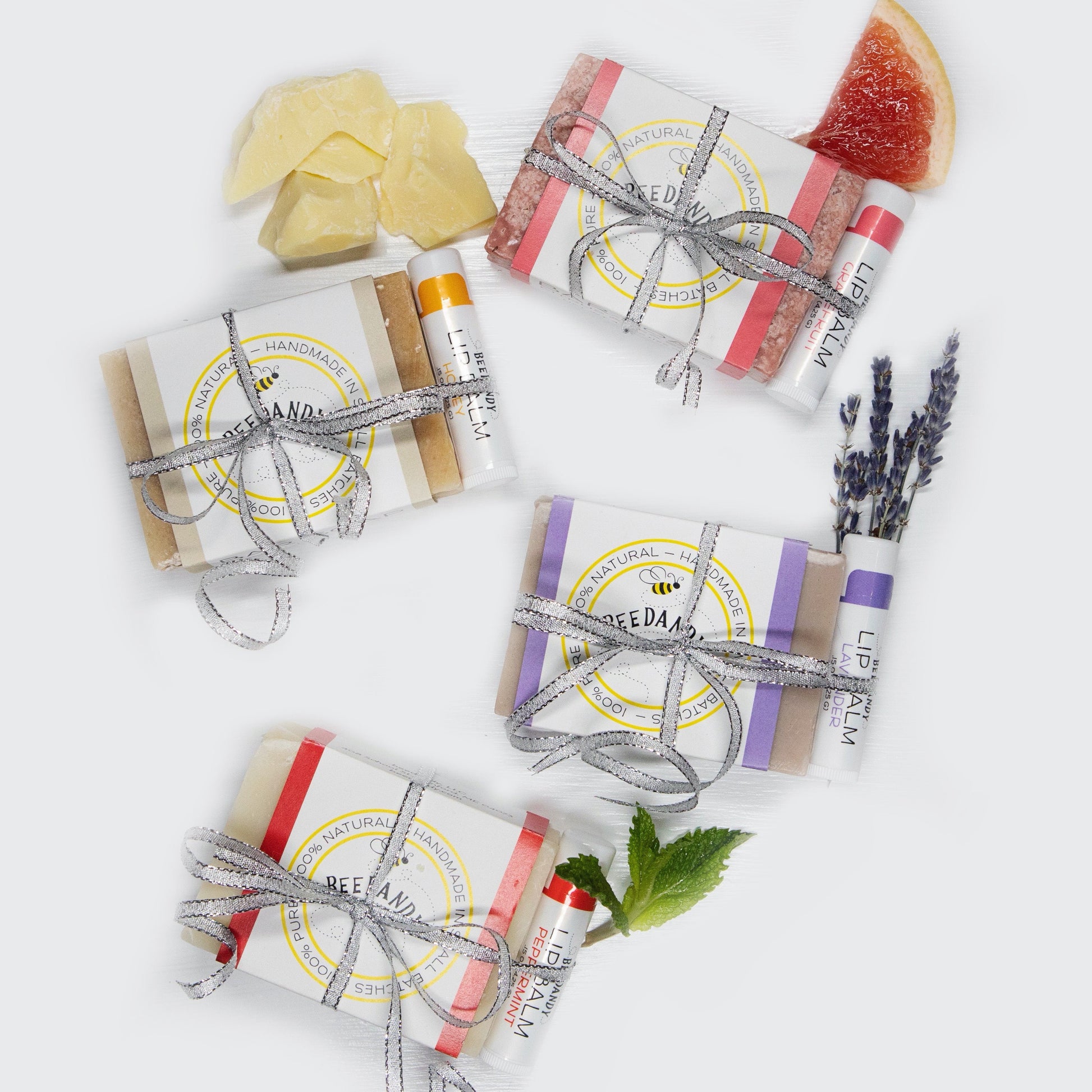 Each set is made to order and includes your choice of bar soap and lip balm, tied with a ribbon for a special touch.